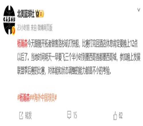 由于前一天楊瀚森還在跟隨開拓者客場對陣快船,然后才從洛杉磯飛往墨西哥,舟車勞頓外加高原反應明顯看出他在PK墨西哥城隊長比賽中身體狀況不佳容易疲勞,導致其上半場出戰時間被切得零碎,約15分鐘里投籃4中2得到4分3板1助1帽。