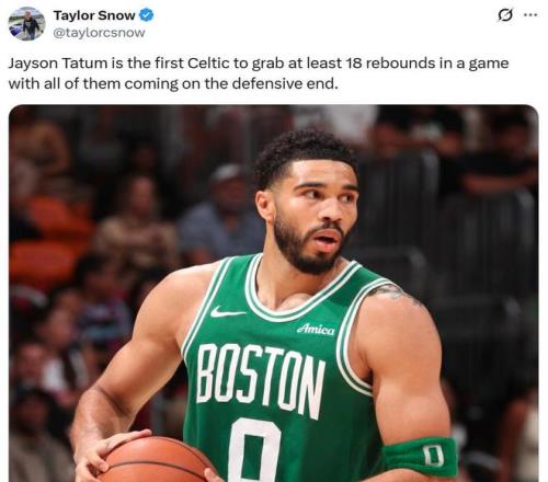 憑借這樣的表現(xiàn),塔圖姆成為凱爾特人隊(duì)史首位單場(chǎng)搶下18個(gè)籃板且都是防守籃板的球員。