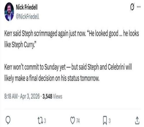科爾確認庫里的確又打了一場隊內訓練賽,并且狀態非常好,看起來就像是斯蒂芬庫里一樣,但庫里仍未獲得復出許可,科爾表示庫里和隊醫會在明天做出最終決定。