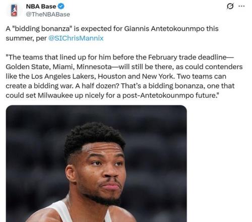 《體育畫報》記者Chris Mannix則在最新報道中指出,勇士、熱火、火箭、森林狼、湖人和尼克斯6支球隊均有意字母哥,休賽季可能引發一場競價盛宴。