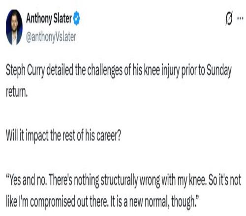 缺陣期間,庫(kù)里在3月中旬迎來(lái)38歲生日。他現(xiàn)有合同還剩一年,并已表示希望在合同結(jié)束后繼續(xù)職業(yè)生涯。當(dāng)被問(wèn)及這次頑固的膝傷是否會(huì)伴隨他剩余職業(yè)生涯、需要長(zhǎng)期管理時(shí),庫(kù)里回答:“算是,也不完全是。膝蓋沒(méi)有結(jié)構(gòu)性損傷,所以上場(chǎng)比賽不會(huì)有功能性障礙。但某種意義上,這會(huì)成為一種新的常態(tài),如果你能理解的話。”