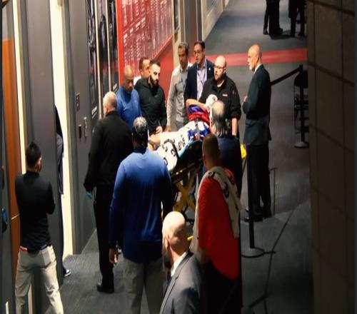 艾維痛苦倒在地上,根本無法起身,最終只能通過擔架被抬離賽場。