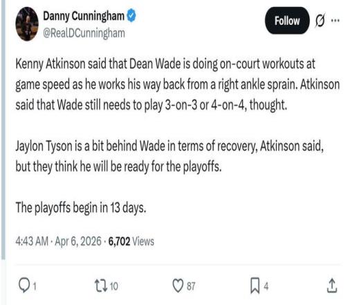 遭遇左大腳趾骨挫傷的泰森,傷病恢復(fù)進(jìn)度比韋德慢一些,但阿特金森表示球隊(duì)預(yù)計(jì)他能夠趕上季后賽。