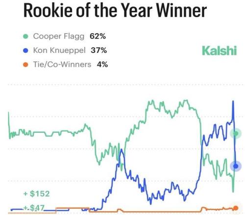 根據預測平臺Kalshi更新的本賽季最佳新秀概率,弗拉格憑借最近兩場的爆發表現,他的獲獎概率飆升到62%,力壓克努佩爾佩爾37%,兩人共享獎項的概率是4%。