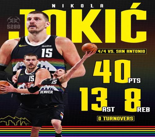 憑借這樣的表現,約基奇成為NBA歷史上首位單場至少交出40分10助0失誤的中鋒球員。