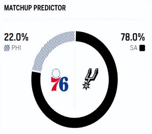 賽前,美媒ESPN對本場比賽進行了勝率預測,馬刺隊勝率高達78.0% ,76人勝率則僅有22.0% ,差距非常明顯。