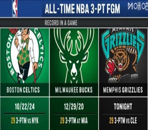 全場比賽還剩1分41秒,灰熊前鋒巴爾弧頂空位三分命中,命中全隊(duì)本場第29記三分,追平NBA歷史單場紀(jì)錄。