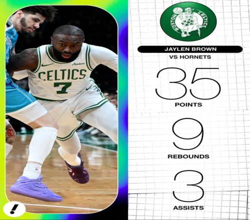 此役布朗全場比賽43分鐘,29中13,三分10中3,罰球7中6,拿到35分9籃板3助攻1搶斷1蓋帽,命中率44.8%,三分命中率30%,真實命中率54.6%,正負值+9,美媒力挺布朗是MVP。本賽季布朗與塔圖姆一同出戰時,布朗場均能拿到28分,綠凱戰績11勝2負。