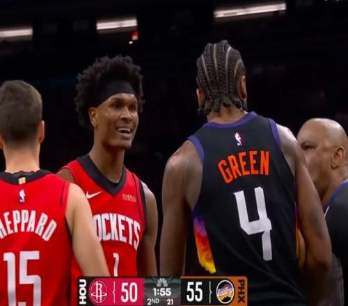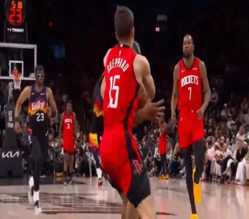 次節回來,申京5投0中后,背身單打時又出現失誤,今天完全不在狀態。泰特撞倒狄龍,兩人發生口角互相推搡,狄龍隨后又造成杜蘭特犯規,火箭太陽不到半場已經出現四次沖突。杜蘭特連中三記三分,火箭最多落后21分現已追到僅差6分。布克連續突破造殺傷,謝潑德三分還能命中回應,半場戰罷,火箭54-57僅落后太陽3分。