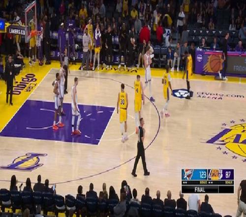 最終雷霆123-87狂虐湖人,贏了36分之多,且每節都是凈勝。