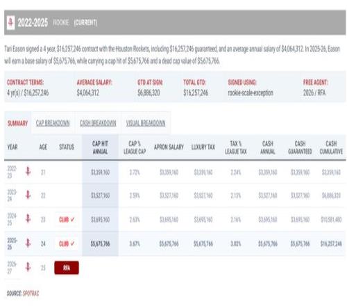 實際上伊森的狀態不穩是很有利火箭今夏壓價的,預計26-27賽季工資帽1.65億,窮人線1.49億,奢侈稅征點2.01億,第一土豪線2.09億,第二土豪線2.22億,火箭隊在轉正戴維森(給兩年合同)后,給伊森均薪低于1800萬的合同,今夏就可以不突破硬帽。