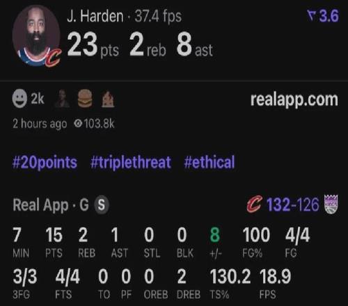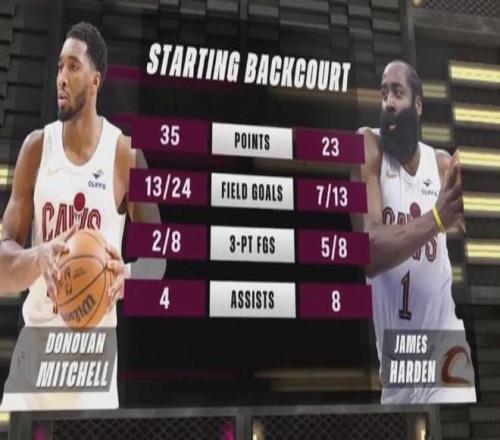 哈登騎士首秀先抑后揚,上半場6中1,下半場7中6包括關鍵時刻連續轟進兩記三分球,最終全場出戰約32分鐘,投籃13中7(...
