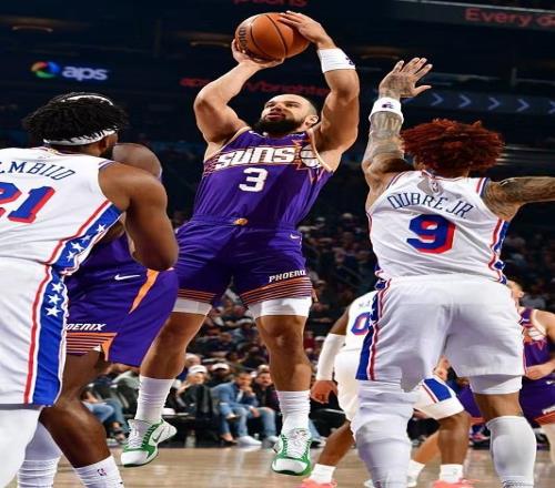 進(jìn)入第四節(jié)比賽,76人內(nèi)外開(kāi)花擴(kuò)大87-71領(lǐng)先優(yōu)勢(shì),鄧恩三分命中,馬克西兩罰全中,太陽(yáng)一波6-0攻勢(shì)追到差9分。76人重新擴(kuò)大94-81領(lǐng)先優(yōu)勢(shì),狄龍三分與中投連追5分,沃特福德三分超時(shí)無(wú)效。沃特福德上籃命中,奧尼爾三分追分,恩比德連得4分?jǐn)U大11分優(yōu)勢(shì),布克三分追分。馬克西造犯規(guī)兩罰一中,狄龍2+1與布克兩罰全中追到差4分,馬克西關(guān)鍵三分命中,布克造烏布雷三分犯規(guī)三罰全中。馬克西也造布克三分犯規(guī)三罰全中,布克再度造烏布雷三分犯規(guī)三罰全中,馬克西被犯規(guī)兩罰全中擴(kuò)大6分優(yōu)勢(shì),太陽(yáng)出現(xiàn)致命邊線(xiàn)球失誤,太陽(yáng)無(wú)力扭轉(zhuǎn)局勢(shì),最終76人戰(zhàn)勝太陽(yáng)收獲賽季第30場(chǎng)勝利。