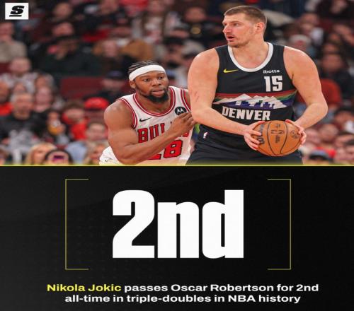 這場比賽也是約基奇的里程碑之夜,他完成生涯第182次三雙升至歷史第二位,在他之前只剩下威少,奧斯卡-羅伯特森181次三雙正式被超越。