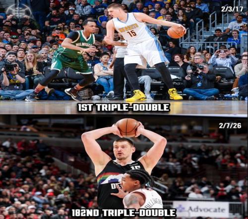 掘金官方曬出了約基奇第一次三雙-第182次三雙的時間跨度,2017年2月3日-2026年2月7日,換言之約基奇182次三雙只用了3292天歷史最快。