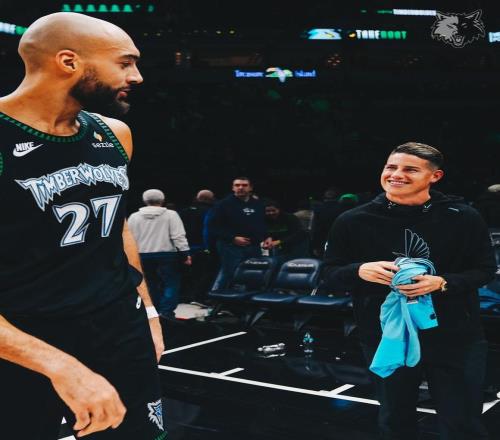 賽后,J羅與森林狼中鋒戈貝爾合影留念,并送上明尼蘇達聯10號球衣,也獲得了戈貝爾贈送的簽名球衣。