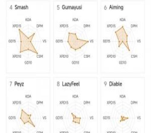 電競體育4月11報道 近日,有國外粉絲制作了4月10日前LCK聯賽的選手數據雷達圖,其中下路選手中Taeyoon的數據較為可觀,而第一賽段發揮出色的Diable則有些“泯然眾人”,最值得在意的是deokdam的數據圖,僅呈現一個冒號!