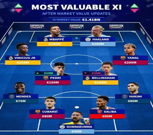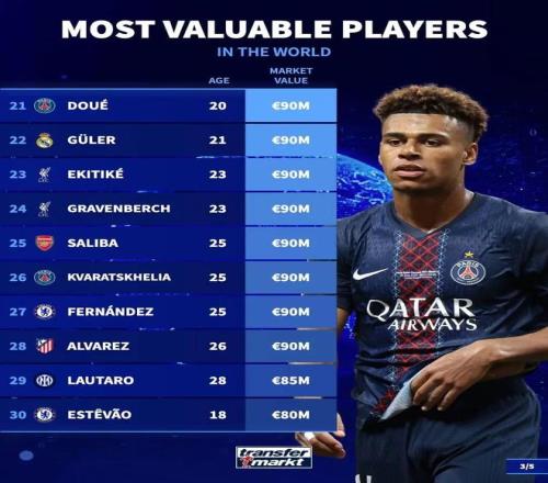 其中西甲聯賽球員中,身價最高的為亞馬爾、姆巴佩,他們的身價均為2億歐,英超聯賽身價最高的球員則是哈蘭德,他目前的身價也是2億歐,德甲聯賽身價最高的球員為目前效力于拜仁的奧利塞,他的身價為1.4億歐,法甲聯賽身價最高的是效力于巴黎的內維斯,他目前身價為1.1億歐。意甲方面,身價最高的是來自國米的勞塔羅,他目前身價為8500萬歐,排在這份榜單第29的位置。