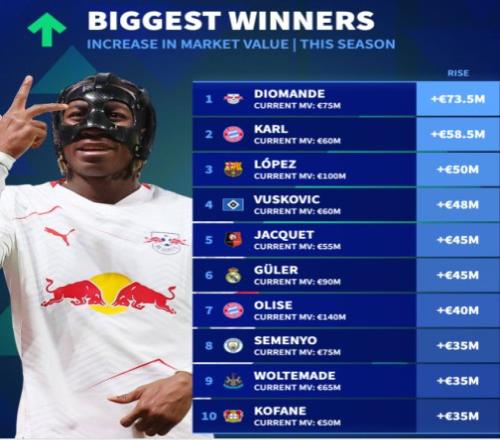 正如相關(guān)圖表所示,倫納特·卡爾排名第二,拜仁慕尼黑新星的身價(jià)上漲了5850萬歐元,達(dá)到6000萬歐元。