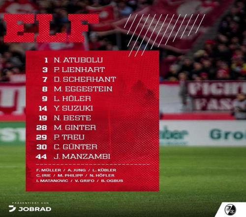 弗賴堡首發(fā):1-阿圖博盧、29-菲利普-特羅伊、28-金特爾、3-林哈特、30-京特爾、8-埃格施泰因、44-曼贊比、19-貝斯特、14-鈴木唯人、7-舍爾漢特、9-霍勒