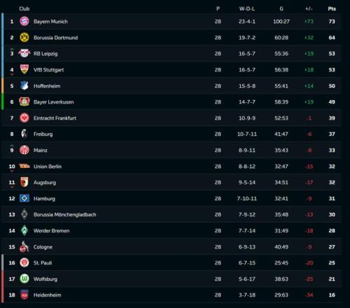 北京時間4月6日凌晨,德甲第28輪九場比賽全部結束。憑借比朔夫、卡爾補時連進2球,拜仁讓二追三擊敗弗賴堡,同時本賽季聯賽進球也達到百球大關;多特蒙德客場2比0笑傲與斯圖加特的強強對話,與拜仁的分差依然維持在9分,而輸球的斯圖加特則是被本輪2比1擊退云達不萊梅的萊比錫反超排名;聯賽第五的霍芬海姆主場1比2負于美因茨,身后的勒沃庫森趁勢以一場6比3狼堡的大勝將分差縮小至1分。