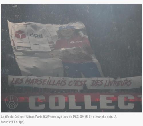 這一被篡改但具有冒犯性的巨幅橫幅影響惡劣。專營包裹運輸與配送業務(隸屬于法國郵政集團)的DPD公司本周一發布公告,表示遺憾其“公司標識被篡改,并用于傳達具有攻擊性且違背其所捍衛的價值觀的信息”。這是在巴黎圣日耳曼隊與馬賽隊比賽(5比0)次日作出的明確回應。比賽中,巴黎球迷展示了一幅巨幅橫幅,上面寫著“DPD”和“馬賽人就是送貨員”。