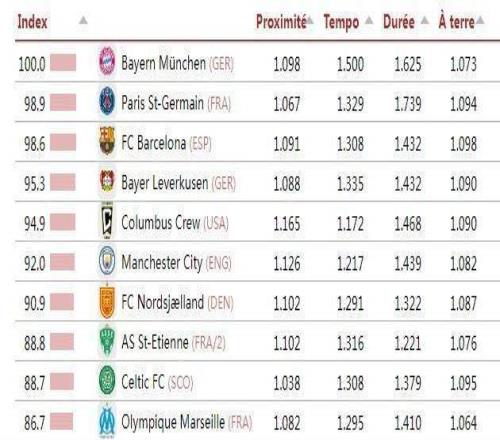 知名數據評測機構足球天文臺(CIES)基于合作伙伴Impect的數據,結合58個主流聯賽公布了全球最具“控球主導、傳控風格”的球隊排名,拜仁以100分的基準分登頂榜首,巴黎巴薩分列二三位。數據核心排名標準通過以下四項技術指標綜合評定:傳球距離(越短越好)、控球階段的傳球速度、平均單次控球時長,以及在前場三分之一區域,膝蓋以下接球的百分比。排名第一的拜仁獲得了100分的綜合評分(即其他球隊以拜仁的100分作為綜合指標),巴黎、巴薩作為二、三名分獲98.9和98.6分。第4-10名分別為:勒沃庫森(德甲)、哥倫布機員(美職聯)、曼城(英超,92分)、北西蘭(丹麥超)、圣埃蒂安(法乙)、凱爾特人(蘇超)、馬賽(法甲)。11-20名分別為:布拉加(葡超)、博德閃耀(挪超)、吉達聯合(沙特聯)、皇馬(西甲,84分)、哈馬比(瑞典超)、圣地亞哥(美職聯)、錫爾克堡(丹麥超)、利物浦(英超,81.9分)、洛杉磯FC(美職聯)和埃爾切(西甲)