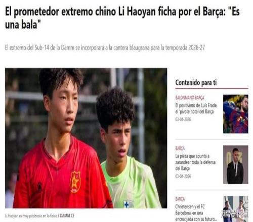 據《每日體育報》報道,14歲中國小將李昊炎將在下賽季加盟巴薩U15梯隊。李昊炎司職邊鋒,目前效力達姆U14梯隊。本賽季打入8粒進球,速度極快,沖擊力超強。