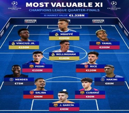 德轉(zhuǎn)列歐冠八強(qiáng)戰(zhàn)最貴陣:姆巴佩、亞馬爾領(lǐng)銜,皇馬3將、巴薩4人