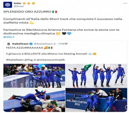 意大利短道速滑隊奪得米蘭冬奧會混合接力賽冠軍,國米官方社媒轉發新聞,并寫道:“輝煌的藍金之光 ,祝賀意大利短道速滑隊在混合接力項目中勇奪桂冠,阿里安娜·豐塔納創造歷史,摘得個人第十二枚奧運獎牌!”