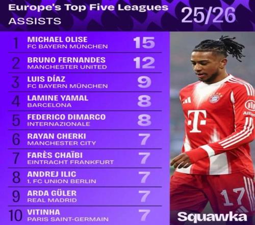 B費本賽季至今在聯賽中已貢獻12次助攻,排名歐洲五大聯賽第2位,僅次于拜仁的奧利塞。