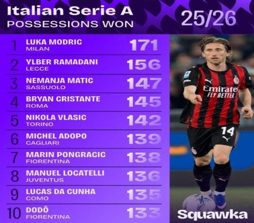 足球數據網站Squawka統計本賽季至今意甲球員奪回球權排行榜,40歲莫德里奇171次第一,馬蒂奇第三。
