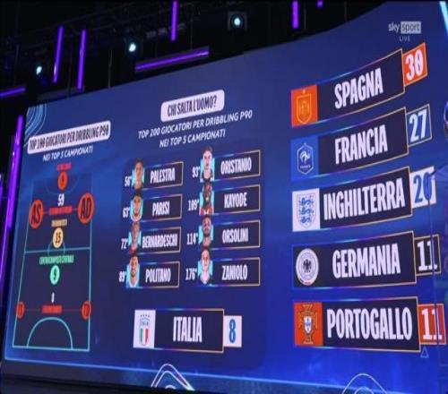 ?五大聯賽每90分鐘盤帶次數前200名的球員里,只有8名意大利人。作為對比,西班牙在這份名單里占據30席,法國有27人入選,英格蘭26人,德國和葡萄牙11人。