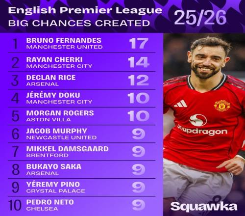 體育播報2月10日宣 數據機構squawka統計了本賽季英超創造重大機會情況,曼聯隊長B費領跑。