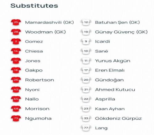 加拉塔薩雷首發:1-恰基爾、93-博埃、90-辛戈、42-巴爾達克奇、4-雅各布斯、34-托雷拉、99-勒米納、7-羅蘭-紹洛伊、8-薩拉、53-伊爾馬茲、45-奧斯梅恩