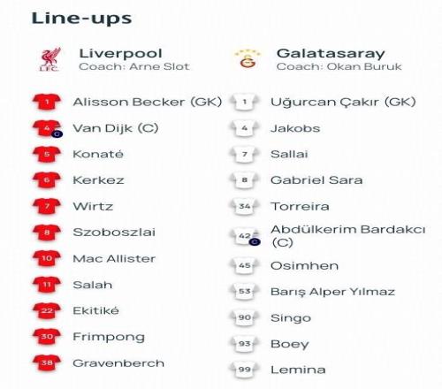 利物浦首發:1-阿利松、30-弗林蓬、5-科納特、4-范戴克、6-凱爾凱茲、38-赫拉芬貝赫、10-麥卡利斯特、11-薩拉赫、8-索博斯洛伊、7-維爾茨、22-埃基蒂克