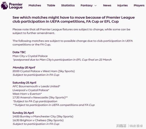 所以,不難發(fā)現(xiàn),涉及這6支球隊的6場比賽,都被標注為可能改期。當然了,足總杯決賽跟英超第37輪也是撞期的,進入決賽的兩隊必須要改期,只是英超方面暫時還沒有列入。