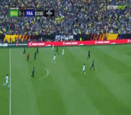 易邊再戰,第54分鐘,于帕梅卡諾禁區邊放倒韋斯利,裁判觀看VAR后直紅罰下,法國隊剩余時間不得不少1人。
