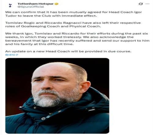 熱刺官方寫道:“感謝3人在過去六周的辛勤付出。我們也深知圖多爾近期遭遇的喪親之痛,并在此艱難時刻向他和他的家人致以慰問。關于新任主教練的任命,將在適當時候公布。”