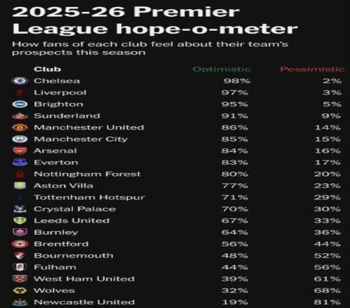 因此,切爾西球迷成為了兩次樂觀指數調查中相差最大的球隊,藍軍球迷的樂觀度直接從第一變成了倒數第一。以下是最新的英超球迷樂觀度排行。