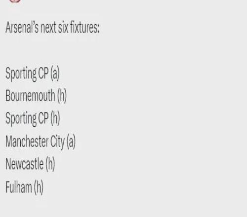 阿森納未來6場比賽對手:客戰葡萄牙體育、主戰伯恩茅斯、主戰葡萄牙體育、客戰曼城、主戰紐卡斯爾、主戰富勒姆。