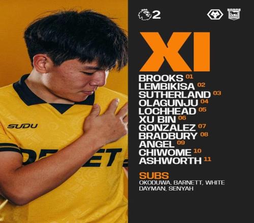狼隊對徐彬的首秀足夠重視,賽前首發名單海報以徐彬為主角,徐彬身穿6號球衣出場,比賽還吸引了一些中國球迷到場觀戰。此役對手是英超2聯賽排名第4的伊普斯維奇U21隊,實力很強。而且還有小雨,比賽天氣條件并不理想。但徐彬沒有怯場,很快進入狀態。開場2分鐘徐彬高位上搶,迫使伊普斯維奇U21隊后場傳球失誤,隊友安赫爾吊射迎來夢幻開局。第27分鐘狼隊岡薩雷斯攻入第3球后,徐彬也與進球隊友擊掌慶祝。