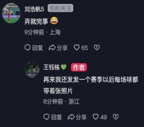 而U23國足的隊友劉浩帆也在評論區力挺王鈺棟:“弄就完事!”王鈺棟則回復道:“再來(舉報的話)我還發,發一個賽季,每場球都帶著這張照片!”