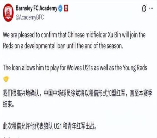 相比于狼隊的官宣,巴恩斯利這邊發布徐彬租借加盟消息的,卻是巴恩斯利足球俱樂部學院。
