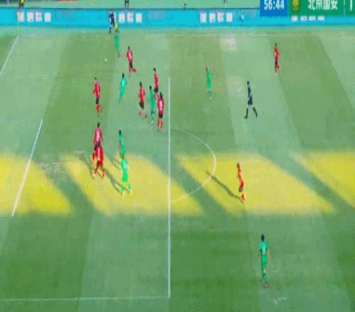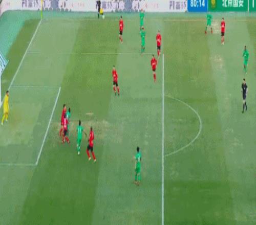 開場僅僅35秒,韓镕澤沖出禁區雙手將球擊出。主裁判向韓镕澤出示黃牌,并且判罰給北京國安禁區外任意球。