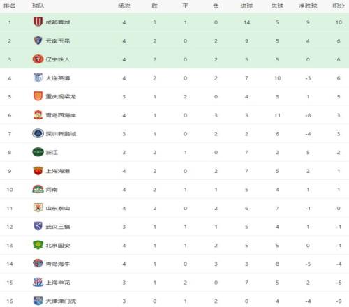 在積分榜上,成都蓉城3勝1平,拿到10分,高居榜首。云南玉昆、遼寧鐵人和大連英博都是6分,排名第2到第4。上海海港贏球之后,總積分達(dá)到1分,升到第9名。山東泰山2勝2負(fù),0分,排名第11。北京國安輸球后,也是負(fù)1分,排名第13。上海申花負(fù)5分,排名第15。