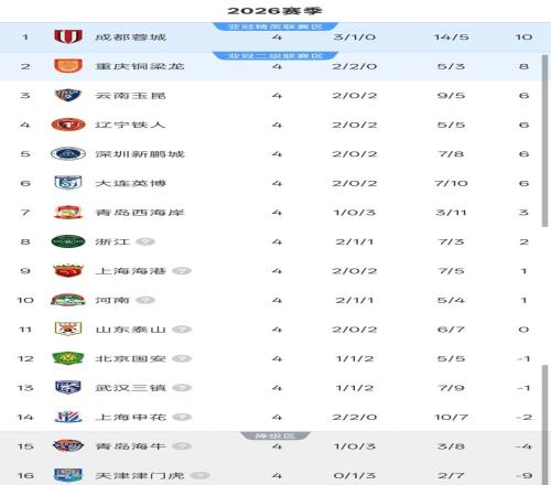 4輪過后的積分榜,排在前二的成都蓉城和重慶銅梁龍保持著不敗,成都蓉城積10分繼續領跑,重慶銅梁龍則積8分重新回到次席,兩隊僅有2分之差。云南玉昆、遼寧鐵人、深圳新鵬城以及大連英博則同積6分,分列積分榜第3至第6。