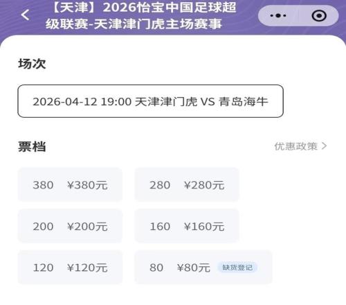 這場比賽的球票已從4月6日12:00啟動(dòng),但截至4月9日11:00,僅有80元檔次的球票售罄,提示缺貨登記,其他檔次的球票依然充足。這應(yīng)該與天津津門虎近期戰(zhàn)績不佳有關(guān)。